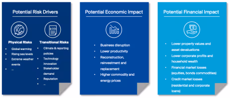 Potential risk drivers[5] can be mainly divided into two categories: physical and transitional risks. Furthermore, due to these risks, substantial economic and financial effects can affect various market participants and their assets. These cannot just be seen as risks only but rather opportunities as well (i.e. resource & energy efficiency).