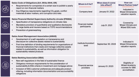 In addition to the planned introduction of the TCFD, there are already some activities in the Swiss market related to sustainability reporting and transparency obligations. The following overview gives quick insights of the most important contents. [11], [12], [13], [14]