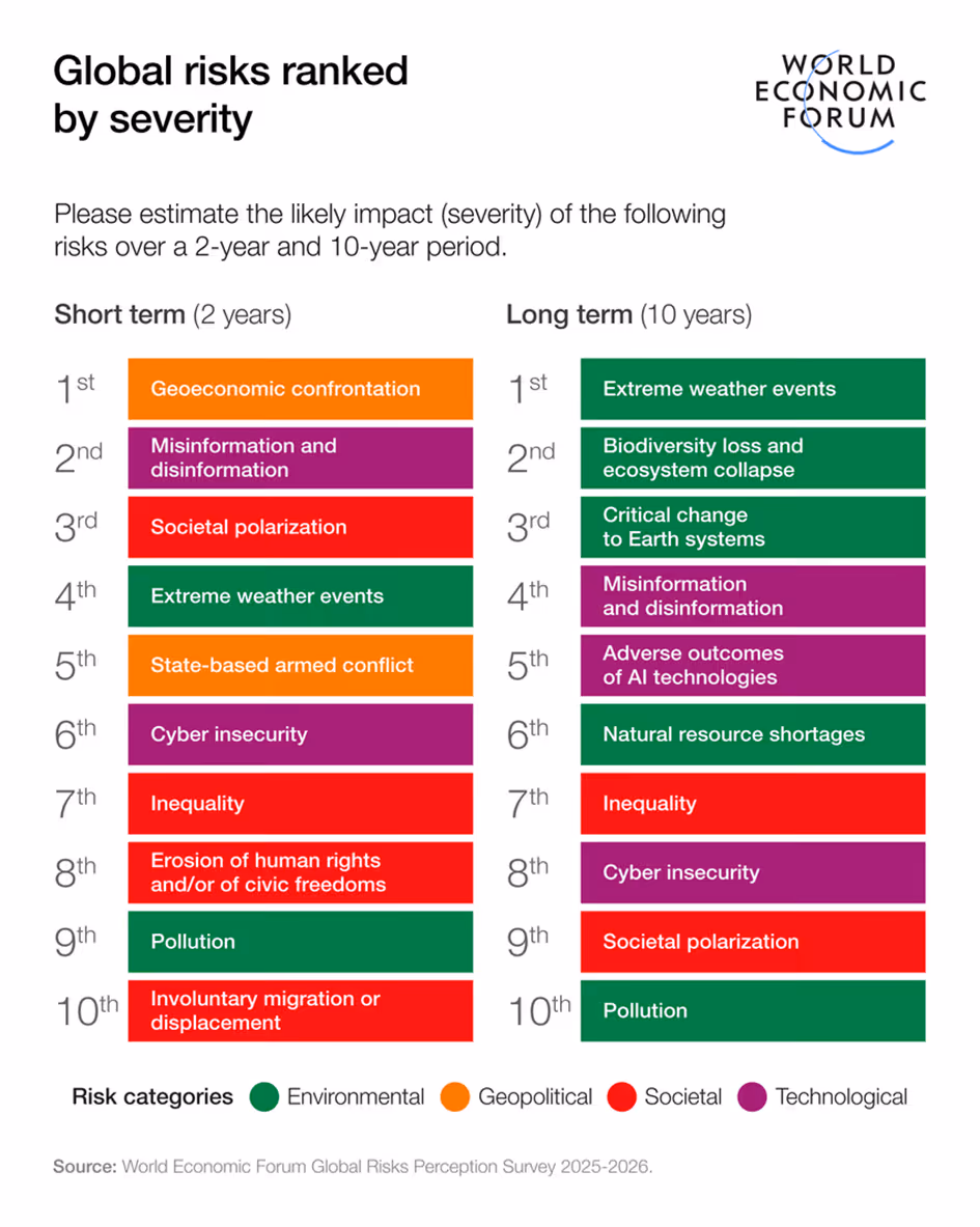 Sixth consecutiveyear: The 2026 Global RisksReport shows environmental risks being reprioritized downward in the two-yeartime horizon despite remaining #1 in 10-year severity. This is the sixth yearclimate appears as top long-term threat in nearly identical language. Havingtracked these reports for years, I recognized the pattern immediately—temporaldisplacement is now explicit. Acknowledged ascatastrophic long-term, deprioritized short-term.
